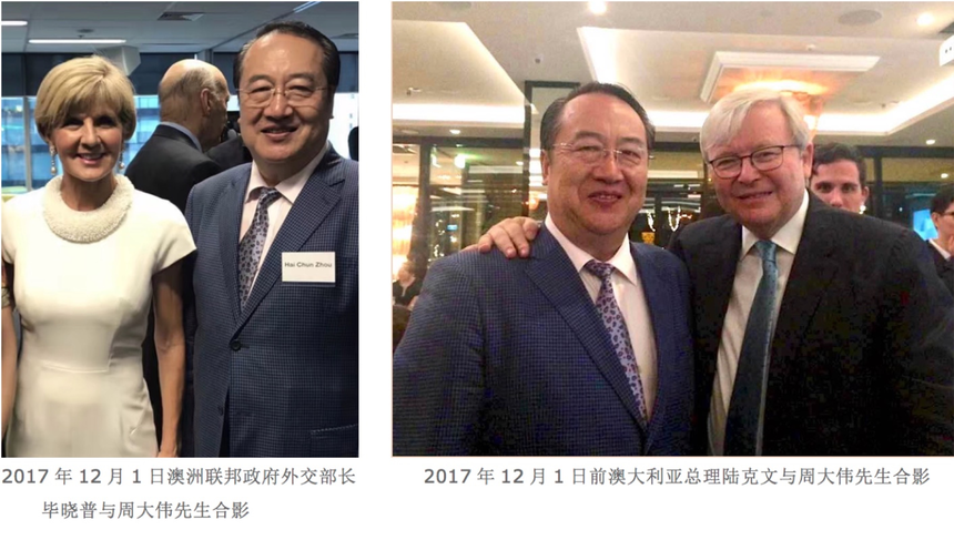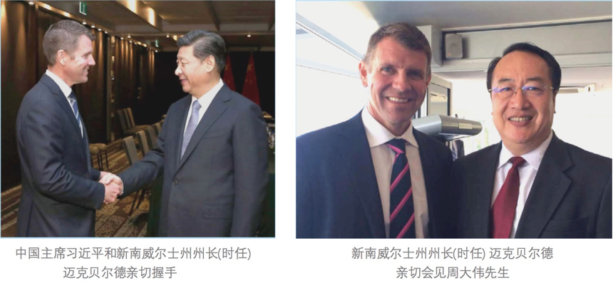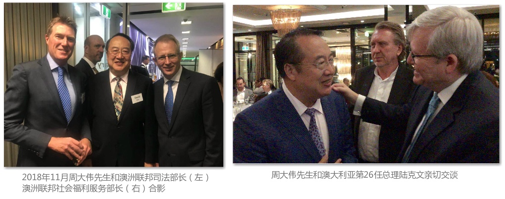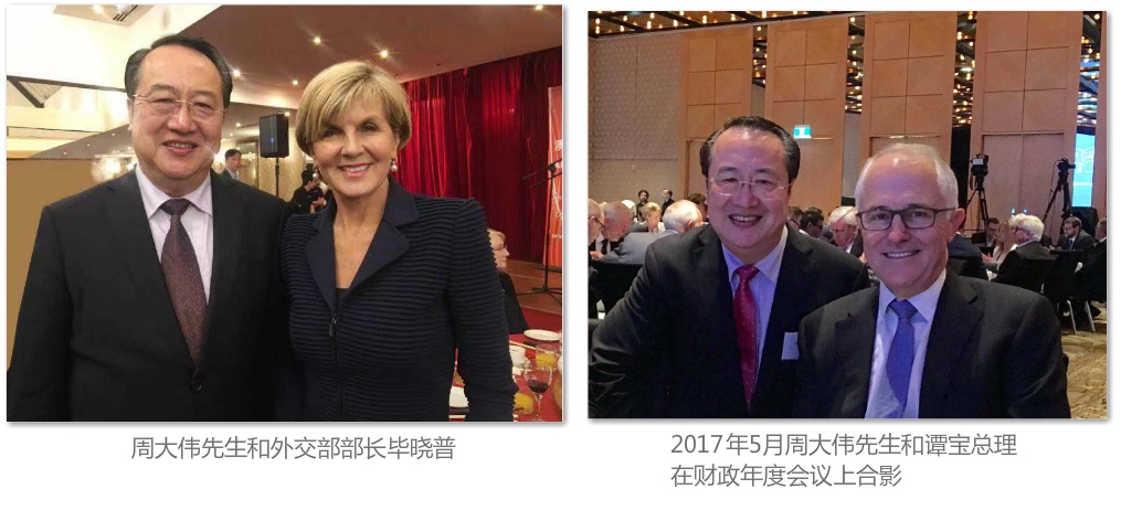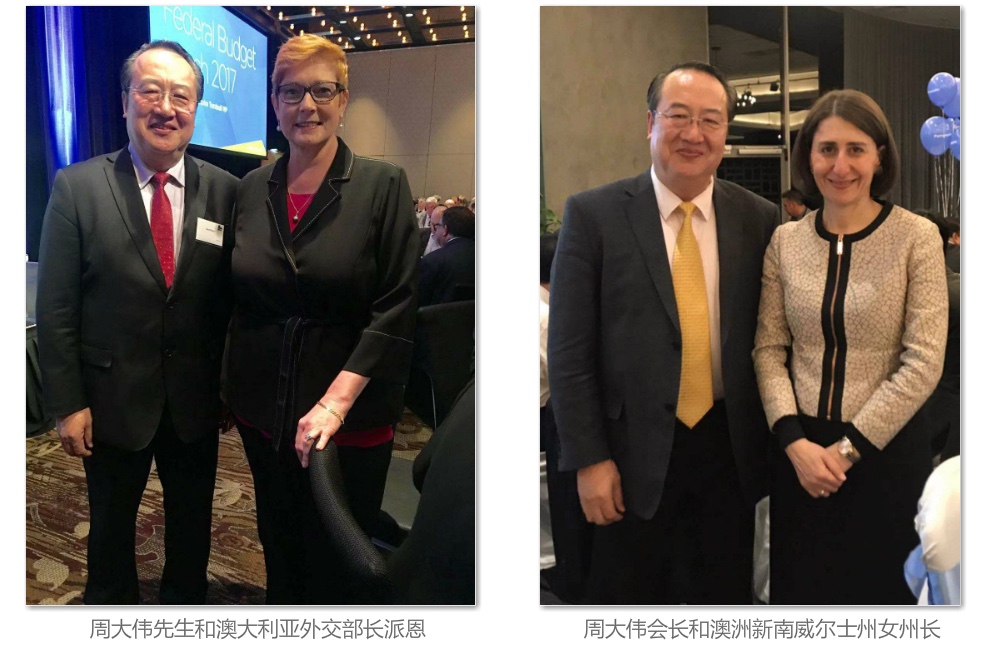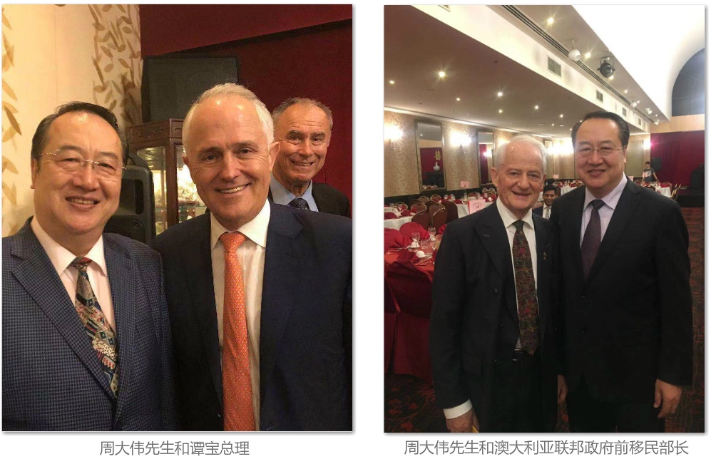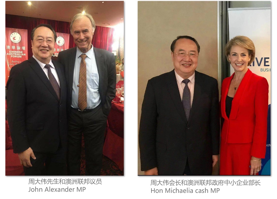 周大伟,David Zhou (太平绅士)曾任:上海市春宇置业发展有限公司(私营房地产企业)法人代表、上海市第二届私营企业协会理事、上海市私营企业直属工委会委员。现任:澳中经济科技文化促进会会长、中澳国际文化节组委会主任、众合国际(澳大利亚)有限公司 CEO 、澳中之窗传媒总经理、中华少年儿童慈善救助基金会“愿景”贫困儿童援助计划主任。 周大伟会长赴澳大利亚创办“澳中经济科技文化促进会”之前,长期致力于国内外经济合作和发展项目,并一直热心资助各项公益文化慈善活动。1986年起周大伟会长在中国上海市创办建筑材料行业和上海春宇置业发展有限公司等企业,从事建筑材料及房地产开发业务,以诚为本,所办企业得到上海市工商行政管理局颁发的“重合同守信用”企业奖牌。 1992年至1998年期间,周大伟会长多次出资赞助教育和文化活动,尤其是1995-1996年出资赞助二届上海市国际茶文化节、国际茶文化节的“春宇杯名人桥牌赛”时任上海市副市长龚学平和时任闸北区委书记姚明宝等出席,并出资举办纪念抗日战争50周年“春宇杯”中小学生演唱会,支持青少年爱国主义的教育等。 1996年9月,在上海市市委党校召开的上海市第二届私营企业代表大会上,周大伟会长被推选为理事,任期为1996-2001年。时任上海市副市长孟建柱(现中央政法委书记)到会讲话并祝贺当选理事。同年,周大伟会长又被选为上海市私营企业直属工委会委员。同年,周大伟会长在上海市“再就业”工程座谈会上的生动发言得到了孟建柱书记的当面赞扬。1996年1月,周大伟会长在上海市光明中学组织举行的上海市“下岗工人”招聘会上的发言,得到了时任上海市副市长冯国勤(后任上海市政协主席)的当面赞扬,并接受了多家电视台的采访。 1996年周大伟会长参加了时任上海市工商行政管理局副局长张文蔚带领的“上海私营企业家代表团”考察团,访问了香港、新加坡和澳大利亚。正是这次考察访问,使周大伟会长决定投身于澳中交流的事业,努力促进澳中两国的经济科技文化的交流与合作。 1997年1月,周大伟会长在澳大利亚悉尼申请注册“澳中经济科技文化促进会”得到了澳大利亚联邦政府的批准,20多年来周大伟会长主持的澳中促进会以促进澳中两国之间的经济科技文化交流与合作为己任,开拓务实搭建澳中经济科技文化的交流平台,20多年来得到了澳大利亚联邦政府和新南威尔士州政府的高度赞扬与支持。 2018年3月,周大伟会长被封为英联邦国家的绅士衔:太平绅士(JP),同时,澳大利亚外交部为支持周大伟会长与各国的交往,颁发了世界经贸组织会员卡(APEC Card)免签证进入世贸合作组织国家并享有外交通道的便利。 会长办公室邮箱:ausch228@126.com。